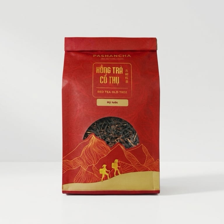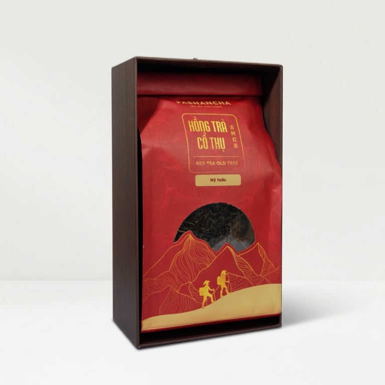 Hồng Trà Cổ Thụ Hỷ Tước được làm từ 100% lá trà cổ thụ 300–500 năm tuổi mọc hoàn toàn tự nhiên trên các triền núi cao Hoàng Su Phì, Hà Giang. Đây là giống trà cổ thụ quý hiếm, không trồng bằng phân bón hóa học, không phun thuốc, mà hấp thụ dưỡng chất từ đất rừng nguyên sinh.