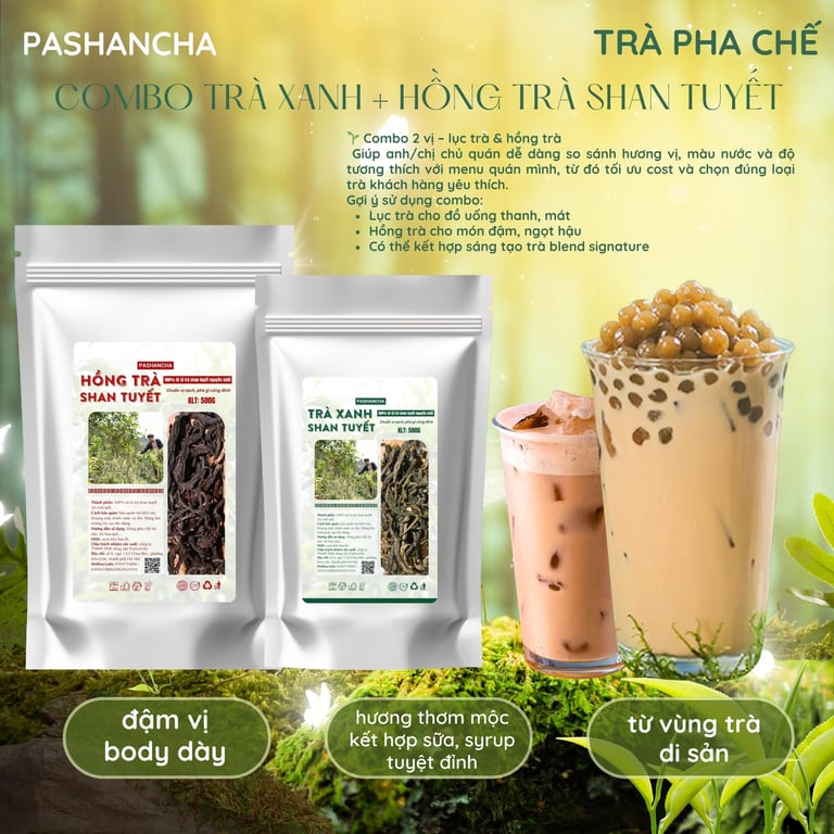 Không chỉ giữ được giá trị tự nhiên của trà Shan Tuyết, hồng trà pha chế còn được tối ưu về vị đậm, ít chát, hậu ngọt sâu – đáp ứng tốt yêu cầu của quán trà, quán cà phê và chuỗi đồ uống chuyên nghiệp.