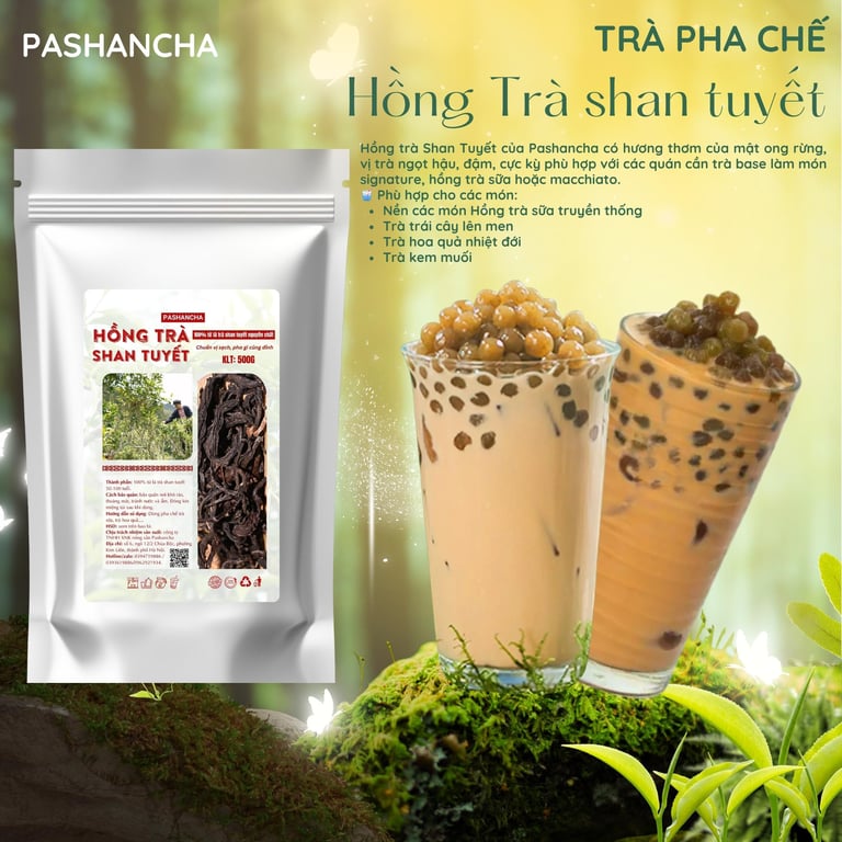 Hồng trà Shan Tuyết pha chế là dòng trà cao cấp được chế biến từ những búp trà Shan Tuyết cổ thụ mọc tự nhiên trên các vùng núi cao Tây Bắc Việt Nam, nơi có khí hậu mát lạnh quanh năm và thổ nhưỡng tinh khiết. Trà được lên men hoàn toàn theo phương pháp truyền thống, tạo nên màu nước đỏ hổ phách đặc trưng, hương thơm mật ong – hoa rừng dịu ngọt, rất phù hợp cho các món trà sữa, trà trái cây và đồ uống pha chế hiện đại.