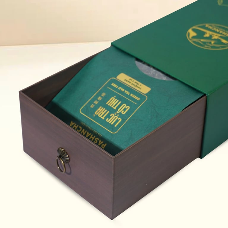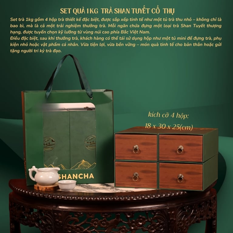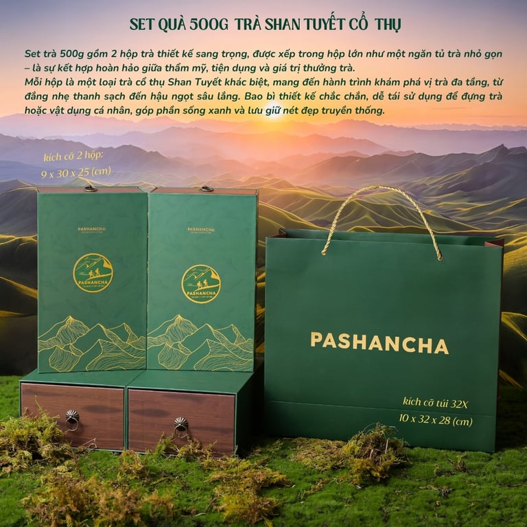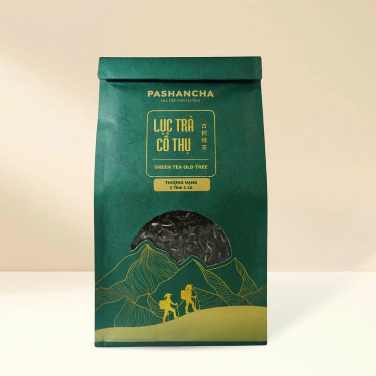 Thành phần: LỤC SHAN 1 TÔM 2 LÁ được sản xuất từ 100% lá trà từ cây trà 300-500 tuổi tại Hoàng Su Phì,Hà Giang. Những búp trà 1 tôm 2 lá chỉ được thu hái duy nhất vào vụ Đông Xuân, khi thời tiết lạnh, trà có độ đắng chát vừa đủ để làm nên phẩm trà này.